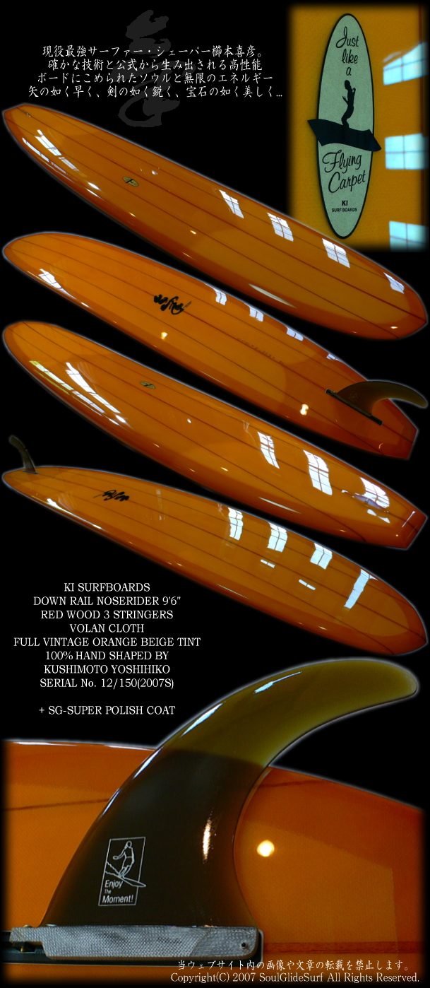 KI SURFBOARDS NEW MODEL !! DOWN RAIL NOSERIDER 9'6" RED WOOD 3 STRINGERS VOLAN CLOTH FULL VINTAGE ORANGE BEIGE TINT COLOR 100% HAND SHAPED BY KUSHIMOTO YOSHIHIKO SIRIAL No. 12/150 (2007-S) <SPEC> ■LENGTH: 9'6" ■WIDTH: 23" ■THICKNESS: 3 1/8" ■STRINGER: RED WOOD 3 STRINGERS ■CLOTH: VOLAN CLOTH + DECK PATCH (KNEE PADOL VOLAN PATCH) ■COLOR: FULL VINTAGE ORANGE BEIGE TINT ■NOSE BOTTOM: SPEED NOSE CONCAVE ■CENTER & TAIL BOTTOM: ROLLED VEE BOTTOM ■RAIL: DOWN RAIL WITH UNDER EDGE ■LEESH HOLDER: CLASSIC RESIN LEESH LOOP ■FIN:KI-FIN 9.25" BROWN TINT (BOX)付属 ■FINISH: GLOSS & POLISH 鏡面仕上 ■SHAPER: 100% HAND SHAPED BY KUSHIMOTO YOSHIHIKO ■シリアルナンバー付 SIRIAL No. # 12/150 (2007S) ※SG-SUPER POLISH COAT