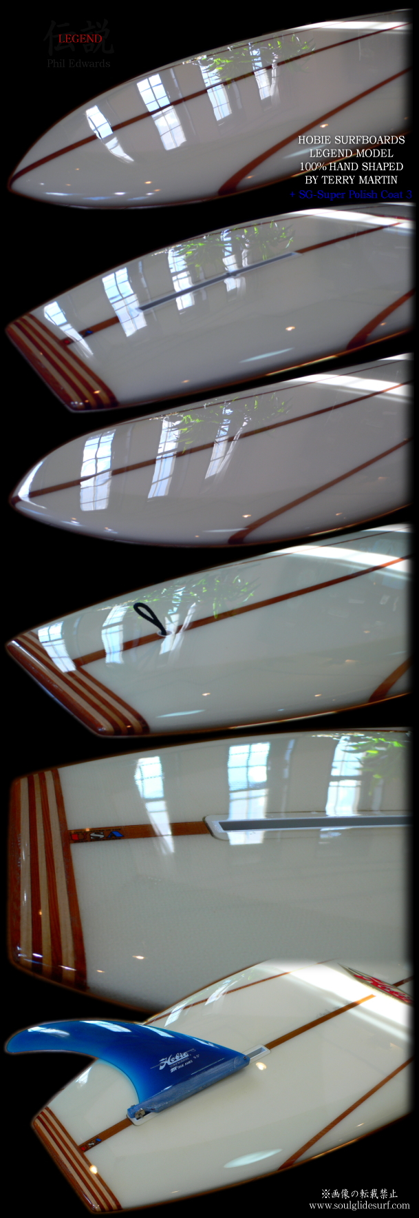 HOBIE SURFBOARDS LEGEND MODEL 9'6" 100% HAND SHAPED BY TERRY MARTIN <EXTRA> ■RED WOOD 3 STRINGERS ■WOOD TAIL BLOCK ■10oz VOLAN CLOTH ■KNEE PATCH (DECK PATCH) VOLAN CLOTH ■FIN PATCH VOLAN CLOTH <SHAPER> ■TERRY MARTIN (100% HAND SHAPE) <スペック> ■LENGTH: 9'6" ■WIDTH: 22 7/8" ■THICKNESS: 3 1/8" ■STRINGER: RED WOOD 3 STRINGERS (US SUPER PREMIUM 高密度 HEAVY WEIGHTFORM!) ■WOOD TAIL BLOCK ■CLOTH: VOLAN CLOTH + KNEE PATCH + FINPACH ■RAIL: TAPERED 60/40 RAIL ■FIN: SINGLE(BOX)専用FIN付属 ■FINISH: GLOSS & POLISH 鏡面仕上 ■SHAPER: TERRY MARTIN (100% HAND SHAPED) ■SERIAL NO.付(#21240) ※SG-SUPER POLISH COAT 3 施工済 <適応> ■対応波レベル:スネ 〜 オーバーヘッド ■適応レベル:ビギナー 〜 上級 1963年発表、世界初のシグネーチャーモデル PHIL EDWARDS MODEL のREISSUE。ロングボード史上No1の評価を受けてきた伝説のモデル。 当時のリアル・プロダクト・シェーパー巨匠TERRYMARTINが完全復刻。 ずば抜けたスピード性能とマジックなドライビング性能を約束。 HOBIE SURFBOARDS の頂点に位置づけされる伝説のプレミアムボード。 <サーフボードの説明> 伝説の名サーフボードを、1963年代当時からそのボードをシェープし ていた TERRY MARTIN 本人の手によって再現。 一言で言うと、スピード&スーパーグライド。一見ガンにでも見えるよ うなアウトラインは特に水のエントリー部のノーズを絞り、不要な抵抗 を一切排除している。また、テイルの絞りにより、水の抜けが非常にス ムーズ。これによって、恐ろしいほどにスピード性能を出している。とに かく早い。そして絞ったノーズの軽さ、テイルの絞り、しっかりしたスクエ アーテイル。程よくついたロッカーが、GLIDE感を超えたクラッシックとは 思えない、マニューバー性能を引き出している。正直言って動く。乗って みると長さ、重さを全く感じない、普段よりワンサイズ長いボードでも充 分動く。そのため、小波でのクルージングだけでなく、長めの板で、BIG WAVE を攻めるのにも適している。小波はもちろん、大波に乗ったとき のテイクオフの速さと、スピード感、GLIDE感は、抜群。その、バランス の良さは、クラシックの概念をくつがえされる程。このようなボードで60 年代、波に乗っていたLEGEND達の事を思いながら今の波をメイクする 事は、時代を超えたサーフィンへのリスペクトを意味する。乗った者の みが知ることができる完成度の高さは語る者の多さが全てを物語って いる。60/40レイル、ロールドボトム、ナローポイントノーズ、スクエアテ イル、太いレッドウッド3ストリンガー、ヴォランクロス、デッキパッチ&フ ィンパッチ標準装備。1952年より HOBIE ALTER,、PHILL EDWARDS らと 共に HOBIESURFBOARDを シェイプし続けてきた巨匠Terry Martinが シェイプ。半世紀 に及ぶ 巨匠 Terry Martinのハンド・シェイプの技術力と ソウ ルを体感してほしい。CA最高水準の仕上りの美しさも老舗中の老舗 である HOBIE SURFBOARDS ならではのもの。 SG-SUPER POLISH COAT 3の施工により、究極の美と性能を極めた1本。 <店長のコメント> HOBIE SURFBOARDS の中で最も好きなモデルが、このLEGENDMODEL。 現存するスピードシェイプスタイルのロングボードの中では、最も乗りやすく、 オールラウンドに活躍する1本であると言えます。50/50レールの良さと、ダウン レールの良さを兼ね備えたレールデザインが、攻めるレールワークも、流す レールワークも、波に調和させるレールワークも全て可能にしてくれます。や や重めのモデルですがビギナーの方が乗られても全く問題はありません。 事実、このボードをご購入されてサーフィンデビューされた方のスクールを行 いましたが、初日でウネリからテイクオフを成功されロングライドを連発。 ライディングの安定感とスピードはとてもビギナーとは思えない素晴らしい レベルでした。スピードシェイプのサーフボードに対して『超硬派』的な、特別 なイメージをお持ちの方もいらっしゃるかもしれませんが、このモデルに関し ては、凄くイージーでオールラウンドな1本です。また日本にありがちなトロ早 いビーチブレイクにおいては、セットアップの早さとスピードの早さと、走破性能 を活かせるので、個人的にはワイドノーズ&ワイドテールのクラシックノーズラ イダー等よりもノーズライディングはコンスタントに行えるし、波に捕まらず高速 で走りぬける(貫通する)性能が非常に高いため、メイク率も高いと思います。 日本の殆どのビーチブレイクの波はワイドなブレイクなので、走り抜けてナンボ の波ですからね。そうそう、フィル・エドワーズもこのモデルで、完璧なノーズラ イドをキメてますよ。LEGENDMODELは無限の可能性を秘めたマジックボードな のです。一生物の1本として、自信を持ってお勧めします。 <シェーパーの説明> Terry Martin(テリ-・マーティン) SEP/3/1937 生まれ、1952年 シェープを始め、1963年よりホビー・アルター、フ ィル・エドワーズと共に数多くのボードをシェープ。今も多くのファンに愛されている。 特に爆発的人気を博した『フィルエドワーズモデル』のプロダク