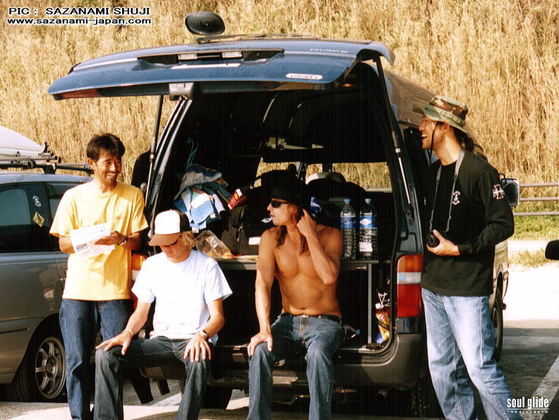 ← BACK 2004 HOBIE SURFING SAFARI IN IRAGO SAZANAMI SHUJI 氏が撮影してくれた写真。 (写真左から、HOBIE SURFBOARDS JAPAN 井上氏、ピックル、ショーン、わきた) NEXT→