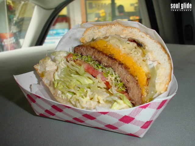 ← BACK TO INDEX NEXT PAGE → アナホラのハイウェイ沿いにあるハンバーガー・ショップ『ONO CHAR BURGER』の『DUANE'S SPECIAL』。 たっぷり野菜とチーズが入ったハンバーガーです。個人的には『LOCO BOY BURGER』がおすすめです。