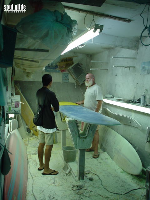 ← BACK TO INDEX NEXT PAGE → カウアイのローカル・シェイパーである"BASA"ことボビー・アレン氏(右)と、マサ氏(左)。 彼のシェイプ、巻き、仕上げは、SGの求めているスタイルではありませんが、 独自のスタイルを持ち、ローカル・サーファーに愛されるオールド・シェイパーの1人です。
