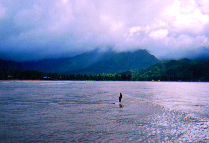 ← BACK TO INDEX NEXT PAGE → ハナレイ・メインがダーティな日、ハナレイ・ピアで櫛本氏&MIEさん達と小波セッション。 スモールサイズながら形の良い波です。 櫛本氏のスタンディングスタイルを真似しながら乗るワキタ。