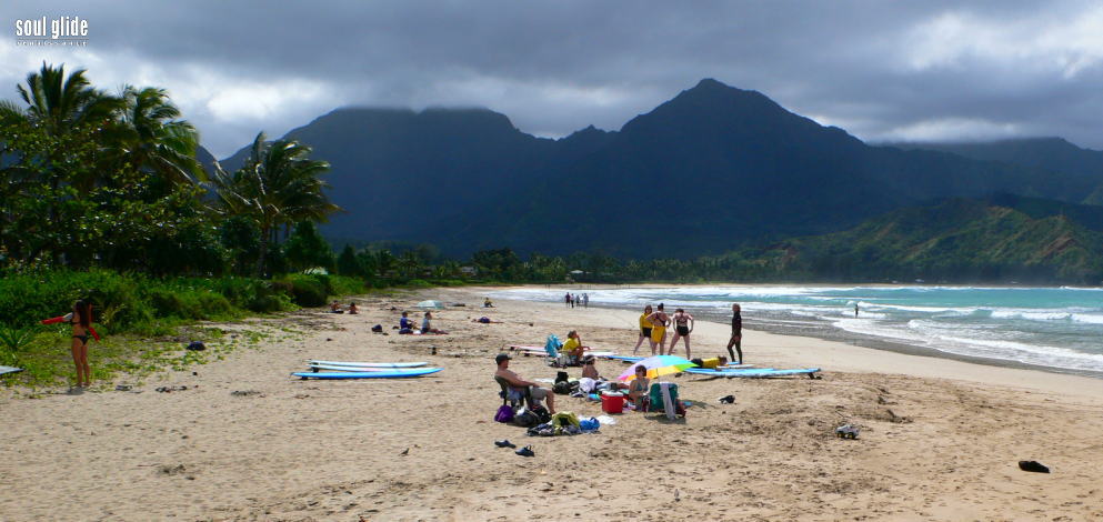 ハナレイ・ベイ・ビーチパーク。ピアから左手を望むの図。観光客のオバサマ達を交えてサーフィン・スクールが行われていました。