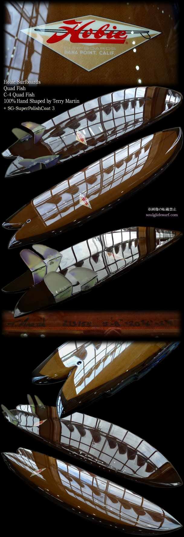 ※このサーフボードは完売しております。 ※カスタム・オーダーの参考画像としてご覧ください。 ※カスタムオーダーは、随時受け賜わっております。お気軽にメールにてご相談下さい。(見積無料)。 HOBIE SURFBOARDS QUAD FISH "C-4" 100% HAND SHAPED BY TERRY MARTIN + SG-SuperPolishCoat 3 <商品説明> ツインフィッシュにスラスター(トライフィン)ショートボード並のマニューバー性能をプラス するべく徹底的にチューニングが施され完成したクァッド・フィッシュ・デザイン。 テールエリアのレールに施されたダブルウイングと、程よく絞り込まれたテイルはフィッシュ デザインながらレールの入れ替えが驚くほどスピーディーで、カットバックも容易に行える。 シャープなエッジが施されたテーパードレール・スタイルながら、十分な浮力があり、驚くほ ど素早いテイクオフ性能も約束。片面フォイルのフロントフィンと両面フォイルのリアフィン と特殊なボトムコンツァーとの絶妙なセッテイングによりスピード性能と回転性能をハイレベ ルで両立。スラスター(トライフィン)ショートボードのように、ターン時にもスピードロスが少 なくスピードを維持したままのミニマムなラインでのクィックなターンや、縦に8の字を描くよ うなラディカルなマニューバー・サーフィンを強力にサポート。ツインのようなフィンアウトも なく掘れたセクションにおいてもしっかりレールをホールドし走りぬけることができる。最先端 の万能トランジッションボード。HOBIE TEAM RIDER のタイラー・ウォレンも昨年の来日の際 自らのC-4を持参し、千葉や湘南の波で素晴らしいアクションを見せてくれた。 <シェーパーの説明> Terry Martin(テリ-・マーティン) SEP/3/1937 生まれ、1952年 シェープを始め、1963年よりホビー・アルター、フ ィル・エドワーズと共に数多くのボードをシェープ。今も多くのファンに愛されている。 特に爆発的人気を博した『フィルエドワーズモデル』のプロダクションボードの多くは テリーによるシェープであり、半世紀に及ぶテリーの技術、ノウハウは、今もホビー サーフボードで生きている。 INTERNATIONAL SURFBOARD BUILDERS HALL ofFameを受賞。(スペシャル・シェ ーパーの殿堂)入りとも言える賞の受賞し、名実共にカリフォルニア・ロングボード・ シーンの頂点に君臨するレジェンド・シェーパー。 マシンシェープを否定し、高精度なハンド・シェープ・ボード製作だけに拘り続ける 彼のサーフボードは、品質、性能、精度、完成度共にカリフォルニアNo.1クラスであり、 多くの玄人サーファー達や、彼をリスペクトするシェーパー達に愛用されている。 彼の親戚にあたる RICH PAVEL はじめ、現代の南カリフォルニアのシェーパー達 の良き指南役としても活躍している。 <ブランド(Hobie Surfboards)の説明> アメリカ、カリフォルニア。1950年から多くのファンを持つ世界No,1老舗ブランド。 現在のサーフボードの原点となったフォームを使用したサーフボードを開発、フ ィルエドワーズモデルや史上初のノーズライダー・モデルなど数々のシグネチャ -モデルを生み出し、ロングボード界をリードし続けているHOBIESURFBOARDS。 品質、性能、共にロングボード・シーンの頂点に君臨するキング・ブランド。