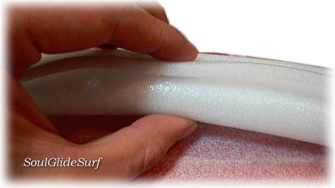 <作業2> じゅうぶんに厚みのあるウレタンシートを3枚(ショート ボードの場合は2枚)重ね、ボードの長さの約2倍の長 さの分厚い帯状のベルトを作ります。 バブルシート(プチプチ)を6枚〜8枚程度重ねた物を 代用する場合もあります。(同等の保護性があります) (レール保護用パーツとなります) |